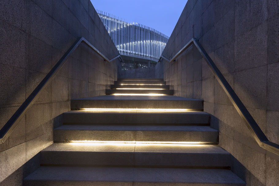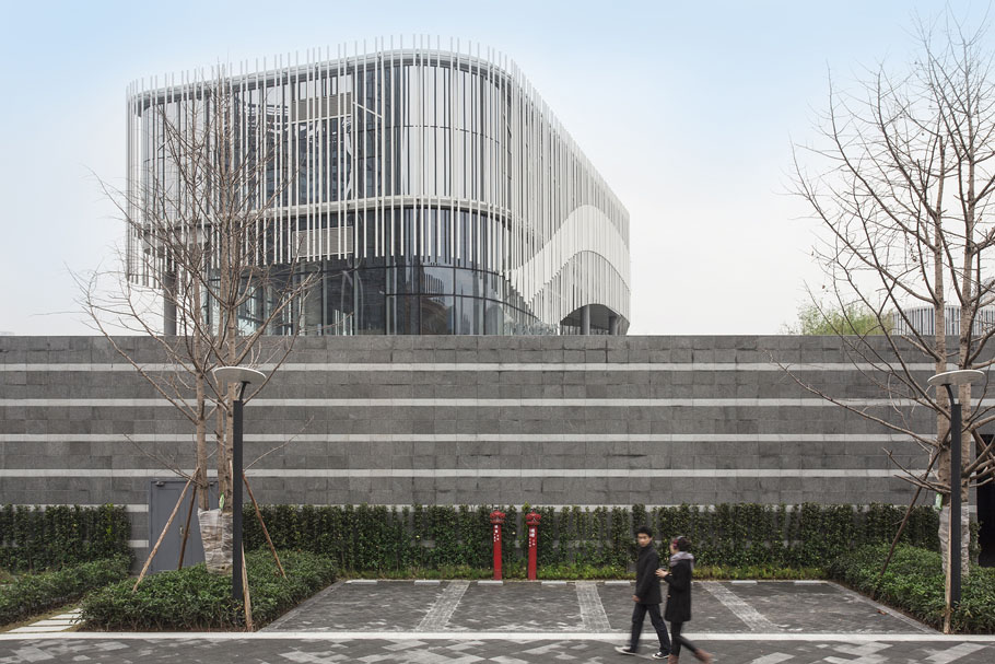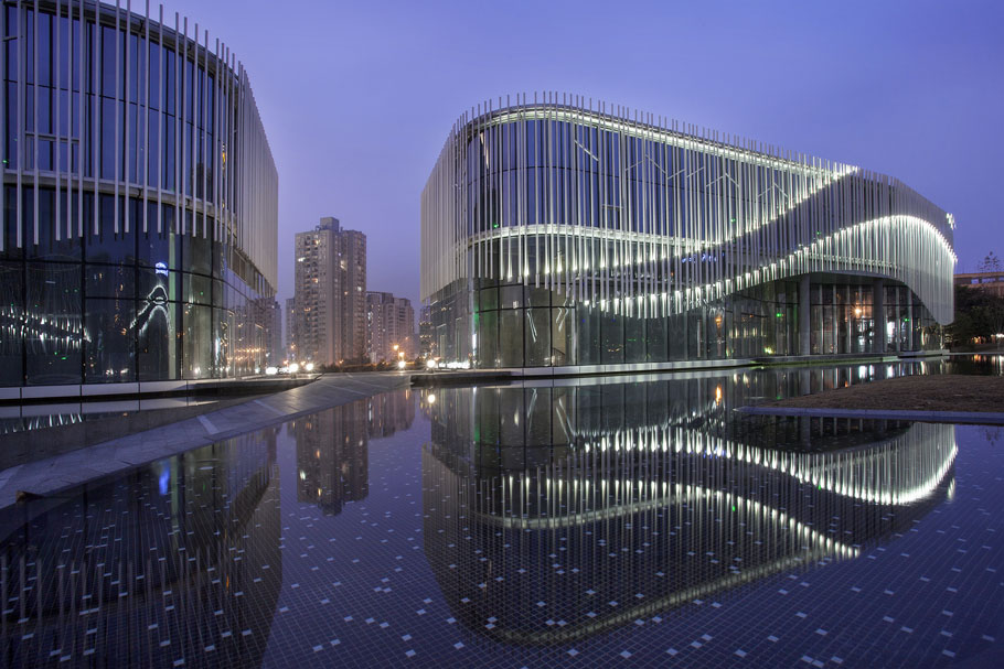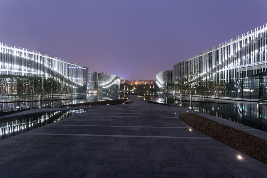 棕榈岛项目位于重庆北部高新园区 ,是重庆棕榈泉地产携手HASSELL一起打造出的重庆商业建筑最新地标。HASSELL同时负责设计棕榈岛的建筑和景观。棕榈岛分为六个独立餐厅,这六个餐厅布置成独立的五个建筑体,全部沿两个湖泊而建。建筑与人造水景形成了“水的庭院”,使得各个餐厅一面享有自然的水景,另一面则可享有人造水景形成的私密庭院空间。从餐厅内望向湖面的视线全无遮挡,并且通过打造无边界水池的做法将人工水景与自然湖面在视线上连成一体。人造水景与建筑布局的概念均反映了重庆两江交汇的城市特色,继承了水系联系城市的概念,以水面包围建筑,形成了“房子水中漂”的建筑形象。棕榈岛建筑和景观在设计上注入了水的元素,将水和光影与建筑融成一体。从远处看,棕榈岛建筑就像浮岛一般漂浮在湖面上,格外别致亮眼。由五栋建筑体组成的棕榈岛围绕着湖水呈八字形,与一大一小的两个湖面构成了一幅美丽的风景。放眼望去,湖面上的倒影与建筑本身不断交错,相映成趣。这一视觉特点也让湖面上的倒影与阳光的折射变成棕榈岛最丰富的建筑特色。棕榈岛也拥非常独一无二的外立面,棕榈岛五栋建筑体均为水晶般的玻璃体,在建筑主体之外,还另外覆盖了一层粗细不同且错落有致的白色陶管。这外立面的设计是专为棕榈岛建筑定制的。别致的陶管与湖水相呼应而产生出的韵律感,让这五栋建筑仿佛自水中沐浴而 出。此外,陶管在镜面上产生反射,白天在日光下产生丰富多变的光影效果,夜间更是晶莹剔透,让人似乎置身梦境。