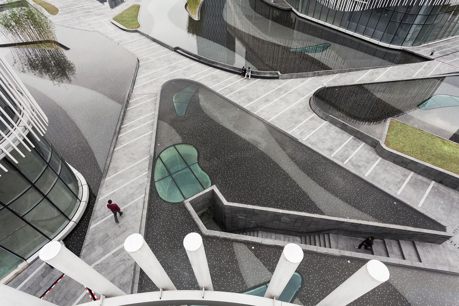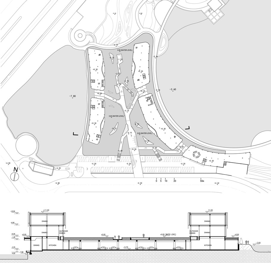 The designers at HASSELL infused their design with water as the key element and melded it with light and reflections for the Palm Island concept. When viewed from afar, the five buildings housing six different restaurants appear to float on the lake, the unique feature for the project by Palm Springs Real Estate Developmen